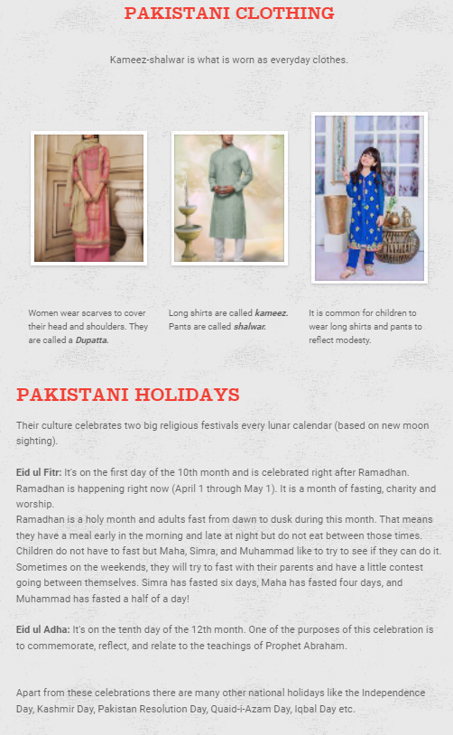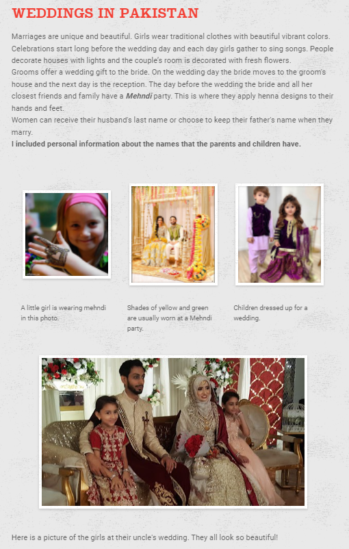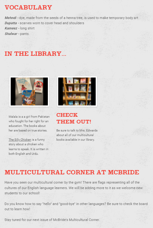 I received half of the questionnaires back with families showing an interest in my project. One family returned the form but was not interested in participating because they have a large family and are too busy. When I met with the mom during conferences, I explained that I could include her family without putting any extra work on them. The mom agreed to let her three daughters be part of it, and I was careful not to burden the family with extra work. I interviewed the daughters during my planning time, and they were full of interesting information. They helped me look up information and images to share. I was pleasantly surprised when one of the girls came to school with a stack of family pictures for me to use in the newsletter. The rest of the participating families were eager to share information with me; it just took some time and patience to receive it. One thing that I would add to my questionnaire is a place for the families to specify how they would like to communicate about their culture. Would they like to meet in person, talk on the phone, correspond through email, or have a Zoom conference? I found that most families preferred to communicate through email. I had to get creative with one family that was not responding to my messages but whose child was eager to participate. I printed off a list of interview questions and asked if he could take them home and have his family help him answer the questions. He returned happily with some pictures. I had to add some research of my own to fill in some of the gaps in the content. I was determined not to let logistics get in the way of engaging our multilingual families with this project. After the first newsletter was published, the ELs were excited to share, and when they carried that excitement home to their families, it became much easier to get more families engaged and excited to share their home culture.